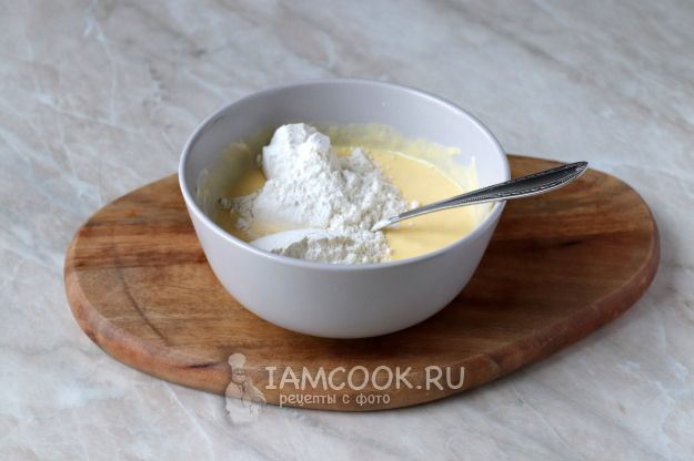 Затем введите просеянную пшеничную муку и разрыхлитель. Муку лучше добавлять не всю сразу, а по одной столовой ложке, каждый раз хорошо перемешивая.
