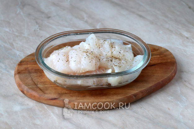 Филе пангасиуса предварительно разморозьте, помойте под холодной проточной водой и просушите бумажными полотенцами. Затем разрежьте рыбу на порционные кусочки, посолите и поперчите по вкусу. Я ещё немного добавила прованских трав.