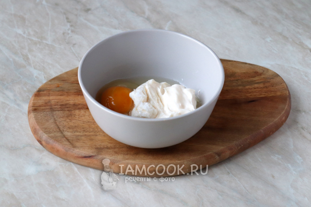 Для кляра соедините в глубокой мисочке куриное яйцо, щепотку соли и майонез (у меня - 72%, вы же можете использовать абсолютно любой).