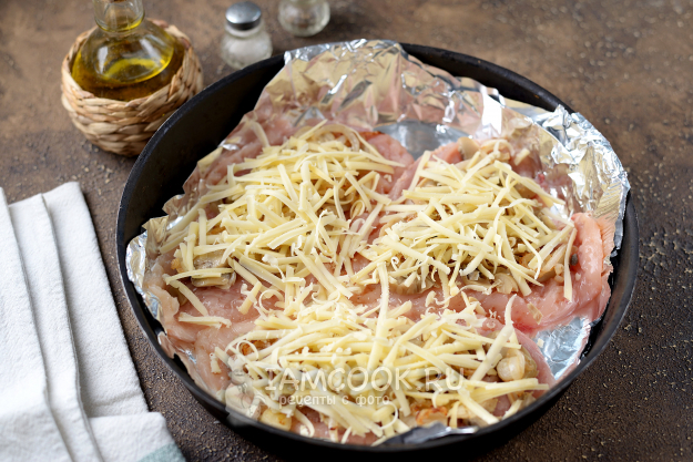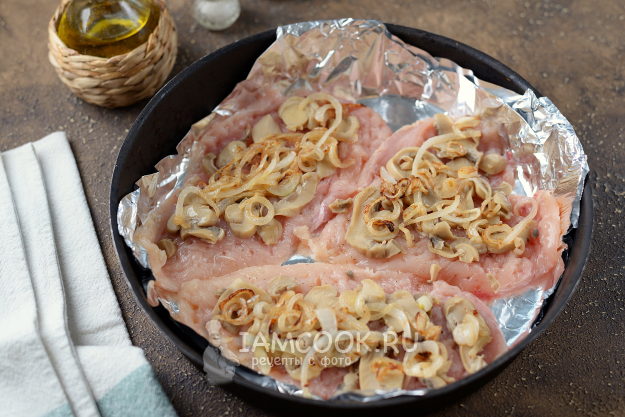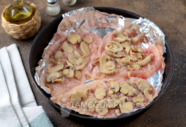 Сверху по курице разложите маринованные грибы в собственном соку.