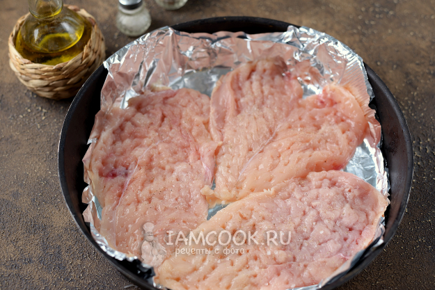 Переложите отбитые куски курицы в удобный противень для запекания, посолите слегка и поперчите.