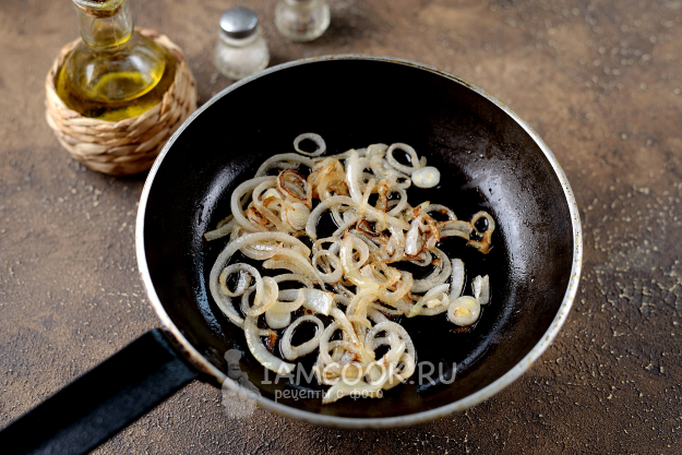 Первым делом нарежьте репчатый лук полукольцами, слегка обжарьте его в минимальном количестве растительного масла на сковороде, остудите.