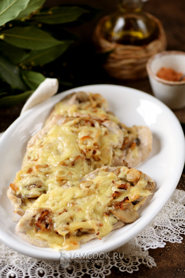 Щедро присыпьте отбивные с грибами натертым твердым сыром и отправьте форму в предварительно разогретую до 180 градусов духовку на 15-20 минут под верхний гриль. Следите за своей техникой, чтобы не пересушить, поскольку куриное филе готовится быстро.