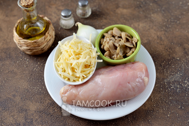 Подготовьте все продукты для куриных отбивных с маринованными грибами (шампиньонами). Куриное филе помойте, обсушите. Натрите хорошего качества твердый сыр на крупной терке. Маринованные грибы используем в собственном соку, тогда в готовом блюде уксусная кислота не будет вас напрягать своим вкусом.