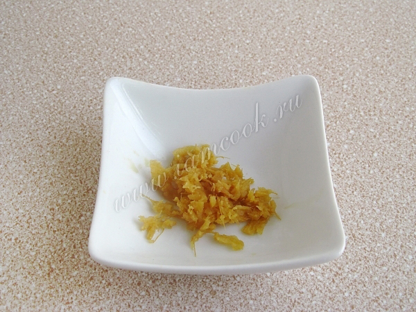 Небольшой кусочек имбиря очистить и натереть на мелкой тёрке. Должна получиться 1 чайная ложка пюре.