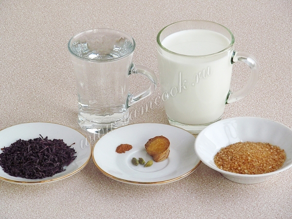 Для приготовления чая «Масала» нужно взять сухой чёрный чай, воду, молоко, коробочки кардамона, свежий имбирь, молотую корицу и коричневый сахар.