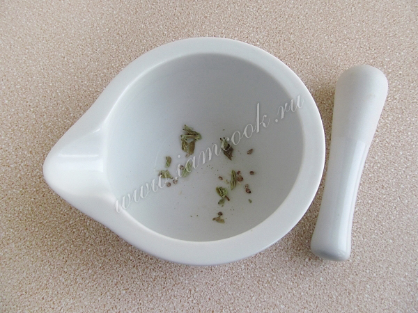 Кардамон положить в ступку и раздавить пестиком.