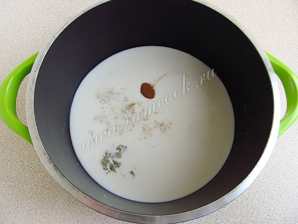 В кастрюльку влить молоко, положить сахар, раздавленный кардамон, корицу и измельчённый имбирь.