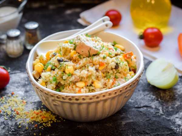 Затем в сковороду добавить булгур, перемешать всё содержимое сковороды.