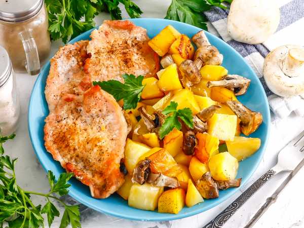 Когда мясо уже можно проткнуть вилкой, добавить в сковороду грибы и готовить вместе 15 минут.