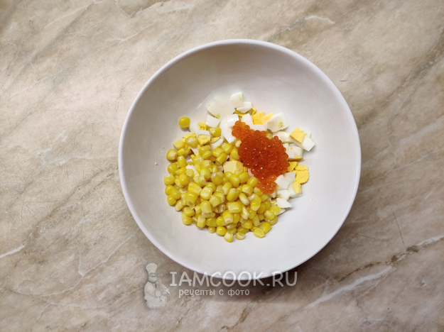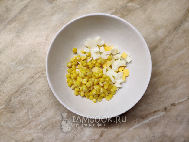 Добавьте в миску консервированную кукурузу, предварительно слив из банки жидкость.