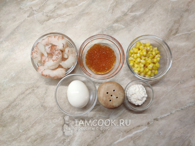 Для начала подготовьте ингредиенты для салата «Царский» с красной икрой и креветками. Креветки у меня очищенные, варено-мороженые. Поэтому я заранее их только разморозила. Сырых же креветок в панцире необходимо дополнительно очистить. Не забудьте удалить и полую вену по спинке. Яйцо заранее отварите вкрутую и очистите.
