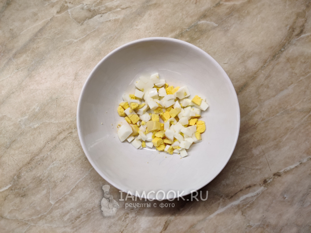 Яйцо мелко нашинкуйте и переложите в глубокую миску. Можно использовать специальное приспособление для быстрой нарезки яиц.