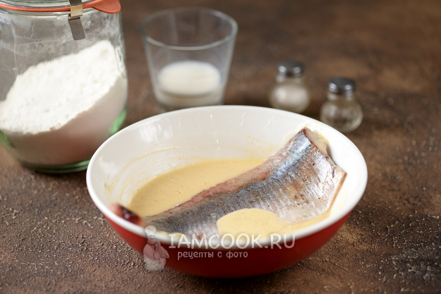 Обязательно промокните филе селедки бумажными полотенцами, иначе кляр может плохо держаться, либо не будет держаться совсем, и тогда придется рыбу обвалять еще и в муке. Обмакните филе в кляр с обеих сторон.