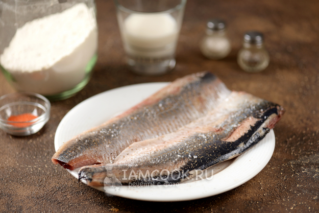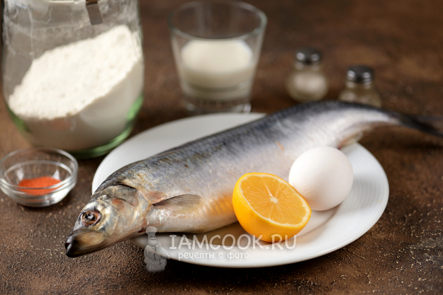 Подготовьте необходимые продукты для жарки селедки в кляре на сковороде. Сельдь предварительно разморозьте при комнатной температуре.