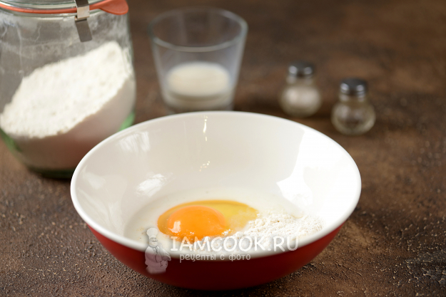 В глубокой миске смешайте до однородного состояния куриное яйцо, муку и молоко. В зависимости от желаемой густоты кляра муки может понадобиться чуть больше. Мне нравится, когда кляр очень густой.