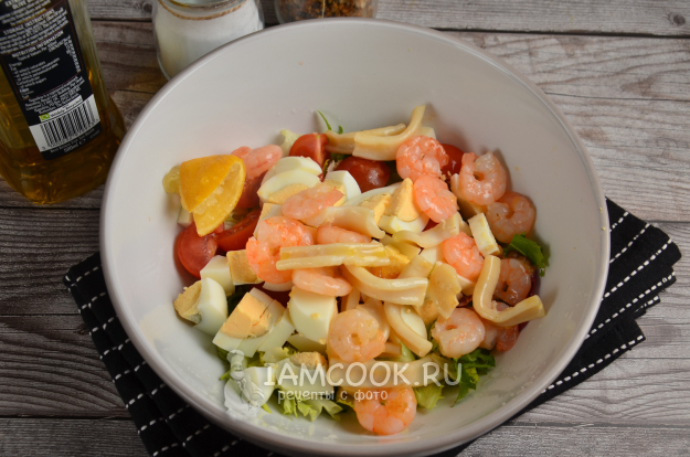 Полейте морепродукты лимонным соком, заправьте салат растительным маслом, подсолите и добавьте специи по желанию.