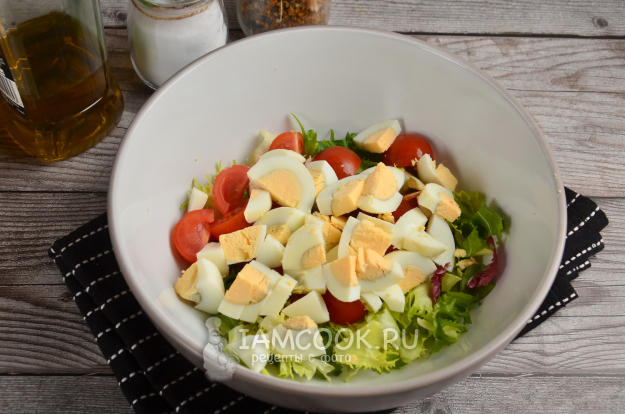 Далее очередь вареных яиц. Их нужно нарезать не слишком мелко и положить в миску.