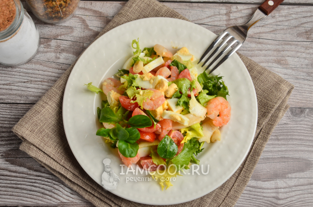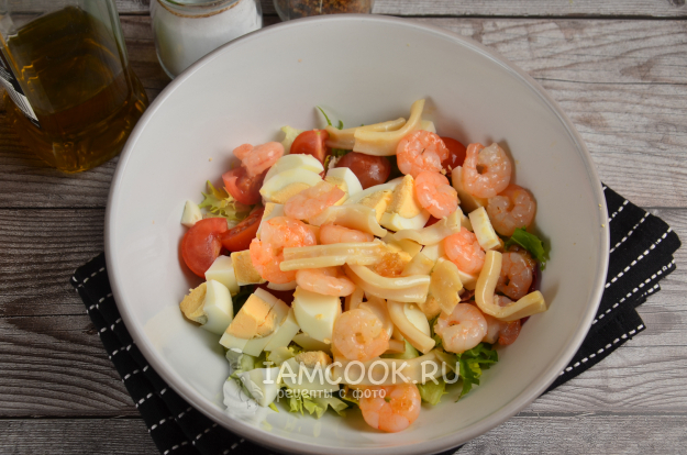 Все перемешайте и сразу же подавайте салат «Морской бриз» с креветками и кальмарами к столу - можно порционно или в большой посуде.