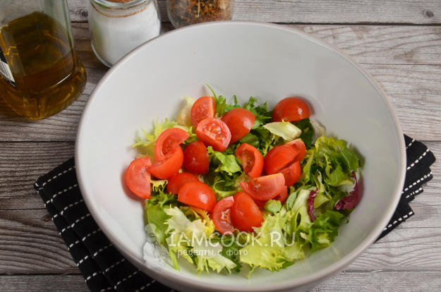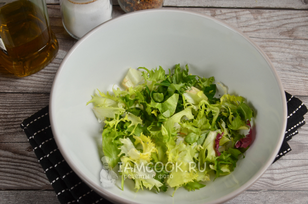 Салатный микс нужно порвать руками или мелко нарезать, сложить в салатник.