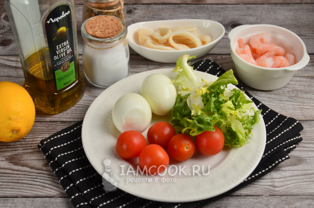 Подготовьте все необходимые продукты для салата «Морской бриз» с креветками и кальмарами. Замороженных креветок и кальмаров нужно разморозить при комнатной температуре. Куриные яйца нужно сварить в подсоленной воде. Помидоры и салатный микс нужно помыть и обсушить.