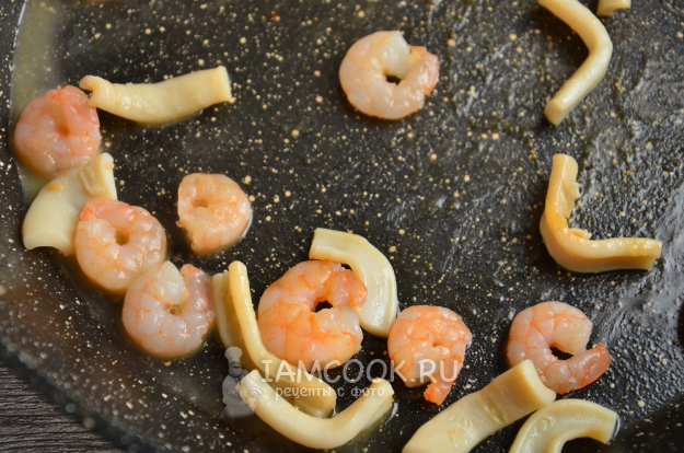 Креветок и кальмаров нужно обжарить на растительном масле в течение 2-3 минут на тихом огне, помешивая.