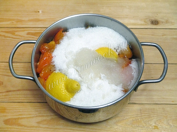 Нарежьте хурму на кусочки и уложите в кастрюлю, пересыпая сахаром. По желанию и по вкусу добавьте лимон (тут половина лимона) или апельсин, корицу и т.д. Если выглядит, что сока для растворения сахара маловато, то влейте немного воды или апельсинового сока. Перемешайте.