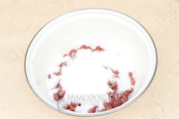 С фасоли сливаем воду. Соединяем фасоль сахар и щепотку соли.