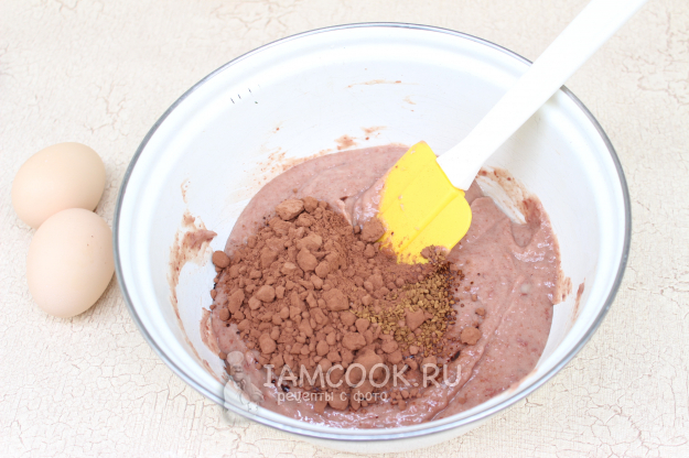Далее добавляем какао и растворимый кофе (по желанию), хорошо перемешиваем, удобно это делать силиконовой лопаткой.