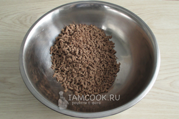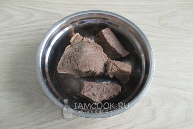 Прокрутите отварную говядину через мелкую насадку или два раза через обычную.