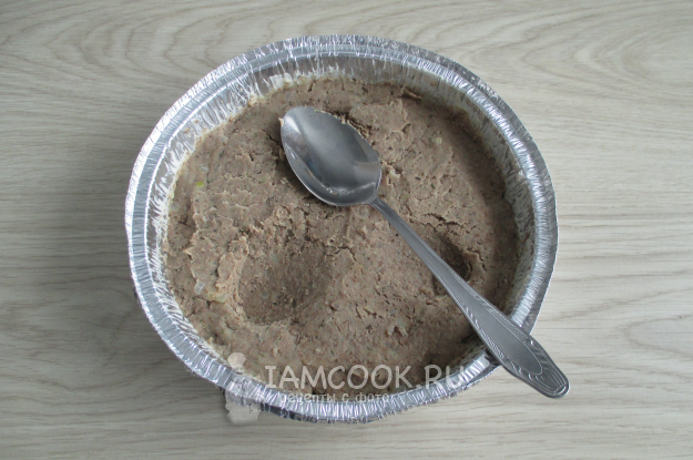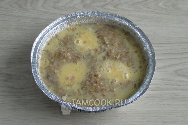 Перемешайте все ингредиенты между собой. Уложите полученную массу в смазанную маслом и обсыпанную половиной панировочных сухарей форму.