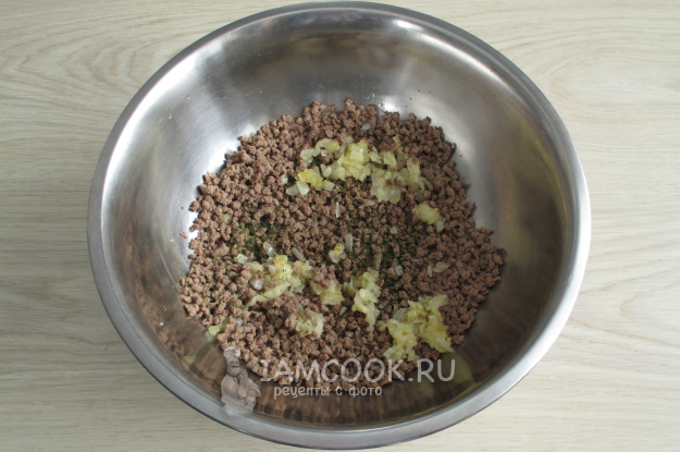 Добавьте в мясо отварной картофель.