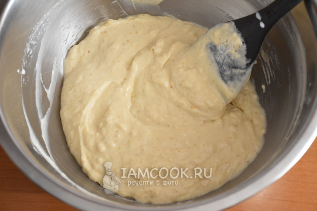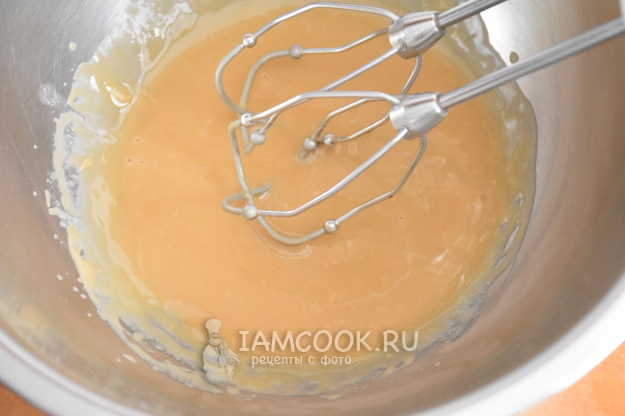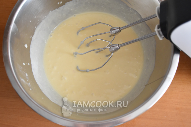 Соединить обе смеси (жидкие и сухие ингредиенты) и перемешать до получения однородного теста.