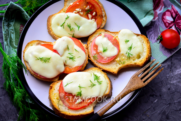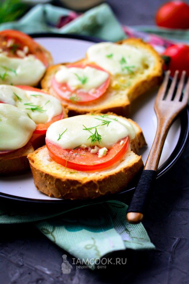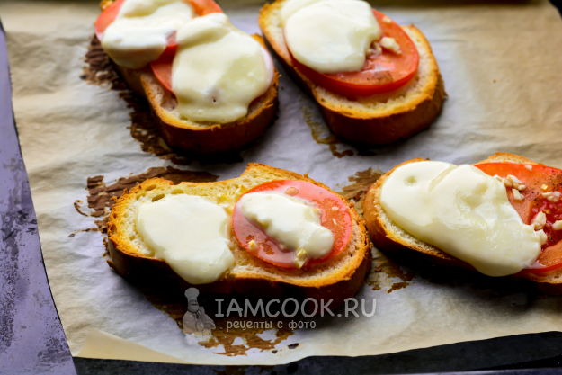 Запекайте бутерброды в разогретой до 200°С духовке около 10 минут. Моцарелла расплавится, помидоры станут еще сочнее. Аромат будет стоять на всю кухню.