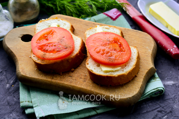 Добавьте по кружочку сочного помидора, овощи чуть посолите и поперчите.