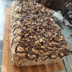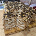 Торт выпекается одновременно на двух больших противнях (размер примерно 40 на 50 см.). Если такой возможности нет, то белковую прослойку для него Вам придётся делать 2 раза, чтобы белковая масса не опала. Делают белковую прослойку непосредственно перед тем, как поставить корж в духовку.