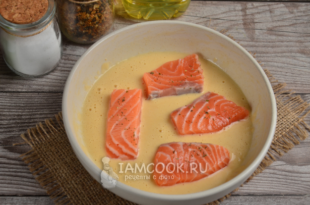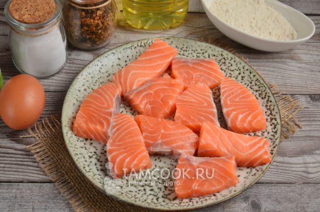 Подготовьте все необходимые продукты для жарки семги в кляре на сковороде. Если рыба была заморожена, разморозьте ее при комнатной температуре.