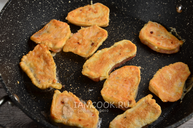 Затем переверните кусочки на другую сторону, накройте сковороду крышкой и жарьте еще минуты 3.