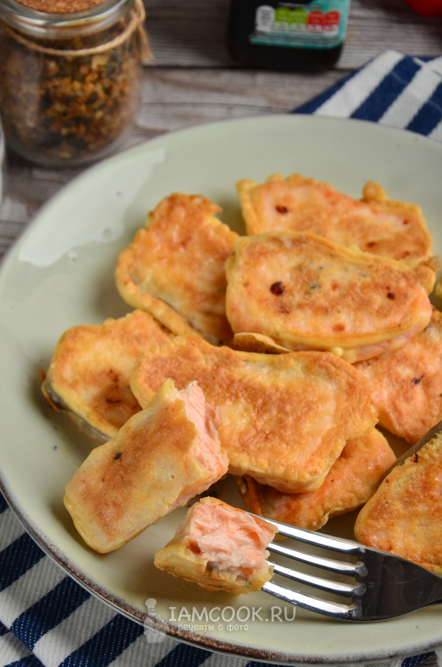 Ароматная нежная жареная семга в кляре готова, подавать ее можно сразу же.