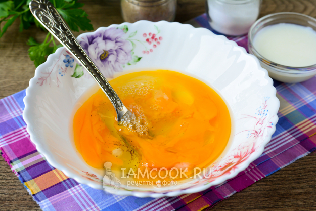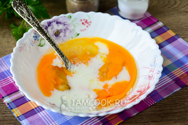 Влейте немного молока и еще раз взболтайте омлетную массу.
