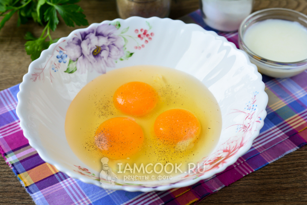 Вбейте куриные яйца в глубокую емкость, посолите и поперчите.