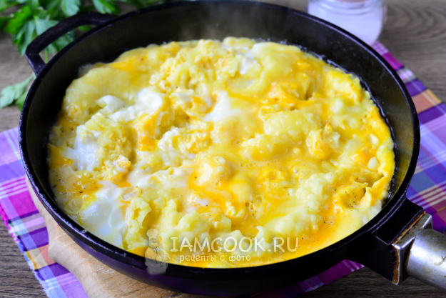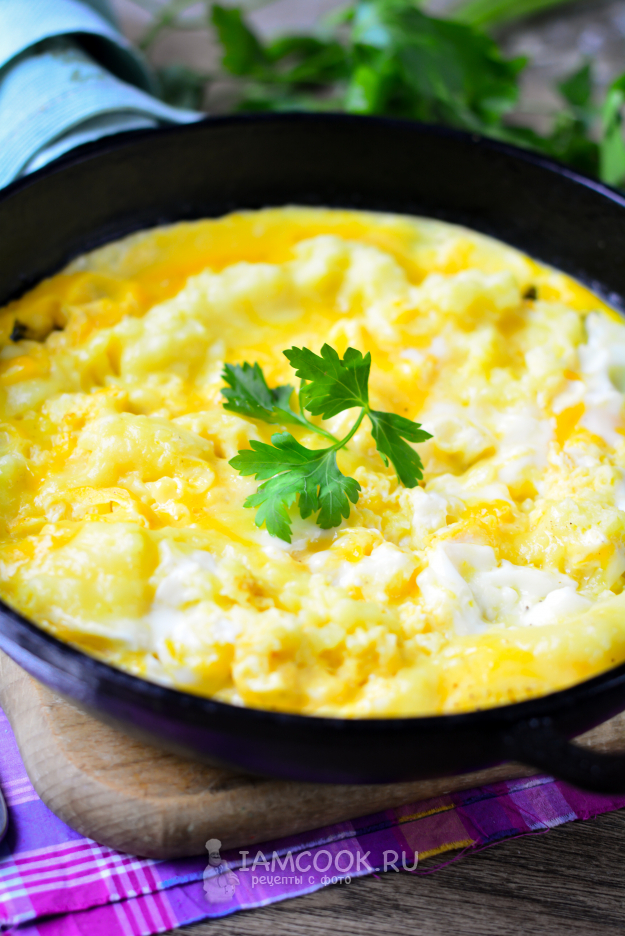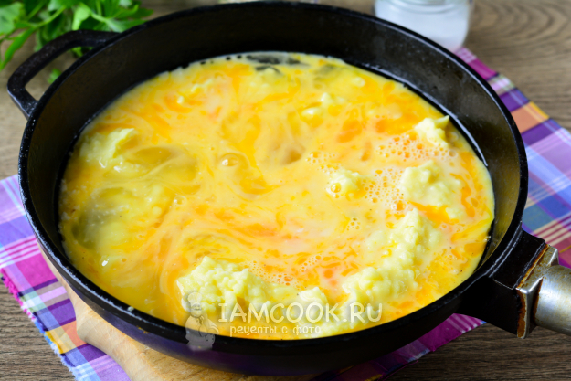 Сверху на пюре влейте омлетную смесь.