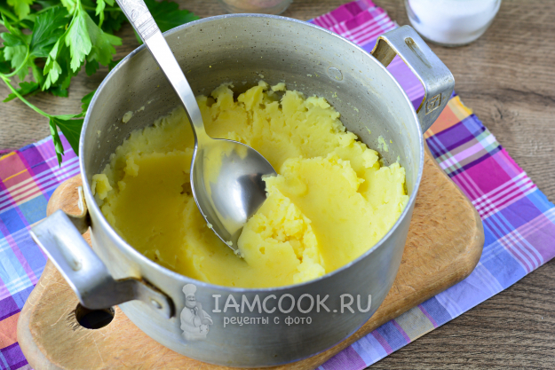 Сварите почищенный картофель в подсоленной воде, затем жидкость слейте, добавьте 50 г сливочного масла и сделайте пюре при помощи картофелемялки. Пюре готово.