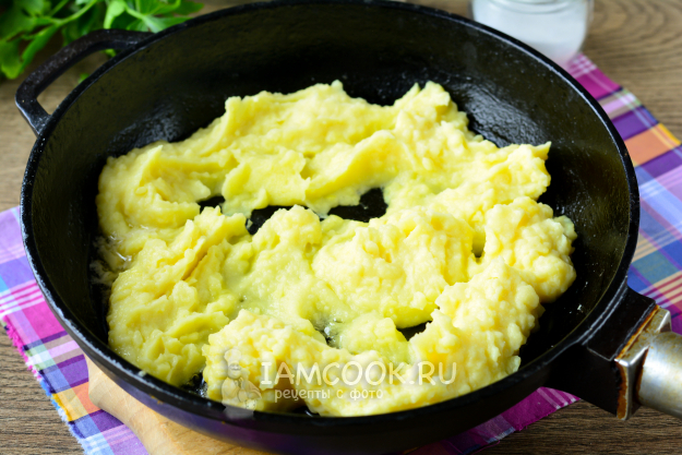 Поставьте сковороду на плиту, разогрейте в ней оставшееся сливочное масло, выложите хаотично картофельное пюре, чтобы осталось пространство для омлета.