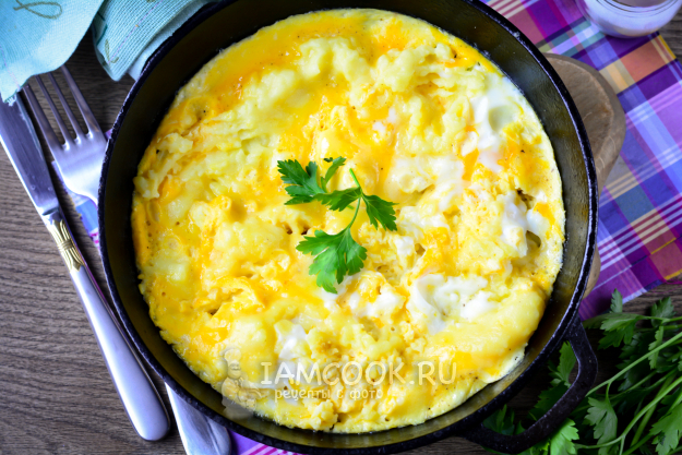 Жарьте омлет с картофельным пюре на сковороде на небольшом огне под крышкой около 7-8 минут. Готово.