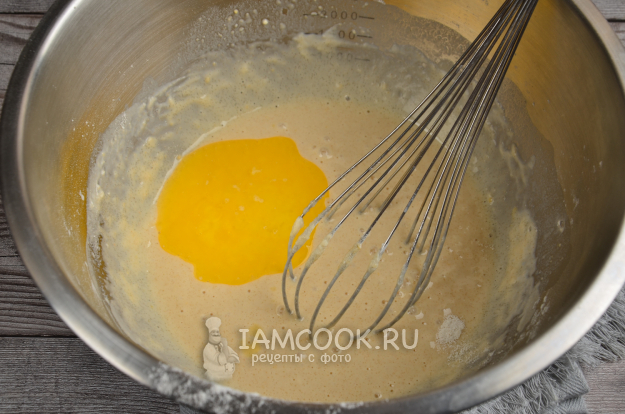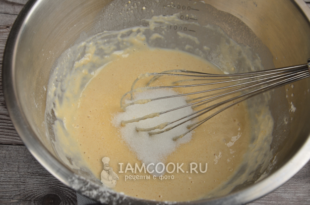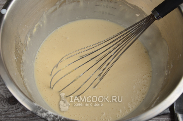 Влейте оставшееся молоко, чтобы получить достаточно жидкое тесто, но не водянистое. Дайте тесту постоять минут 15, перед самой жаркой еще раз перемешайте венчиком.