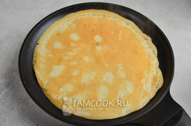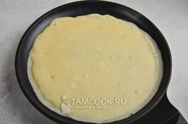 Для жарки первого блина смажьте сковороду кусочком сливочного масла. Налейте небольшое количество теста и распределите его по всей поверхности. Жарьте на слабом огне пару минут.