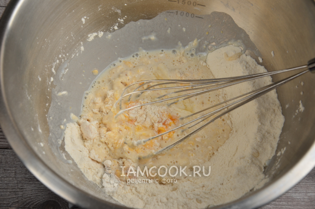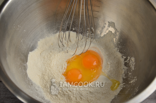 В миску насыпьте пшеничную муку и вбейте пару небольших яиц. Начните размешивать венчиком.