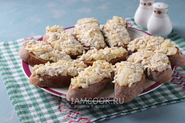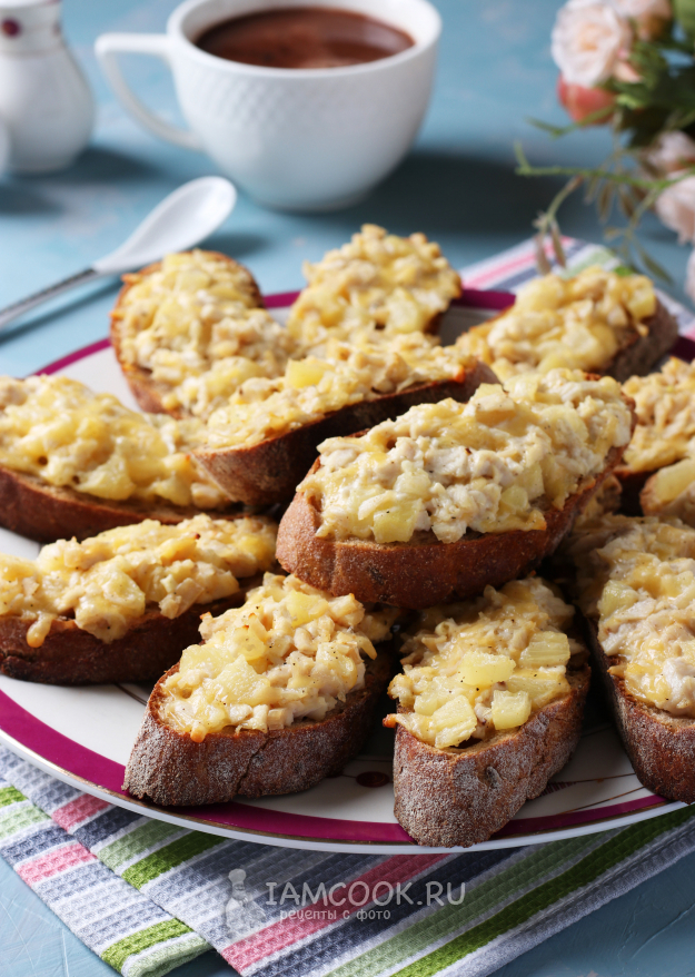 Заварить чай, кофе или какао, подать бутерброды с курицей и ананасом сразу к столу.