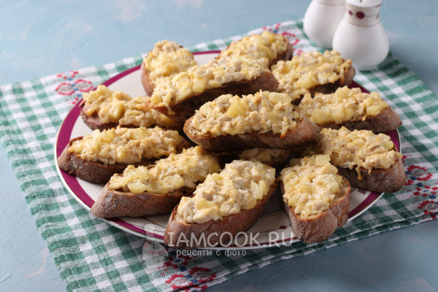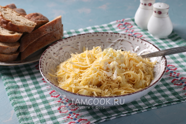 Натереть на тёрке сыр, добавить его к общей массе. Добавить майонез и измельчённый чеснок. Если бутерброды предполагается съесть перед походом на работу, то чеснок можно исключить.